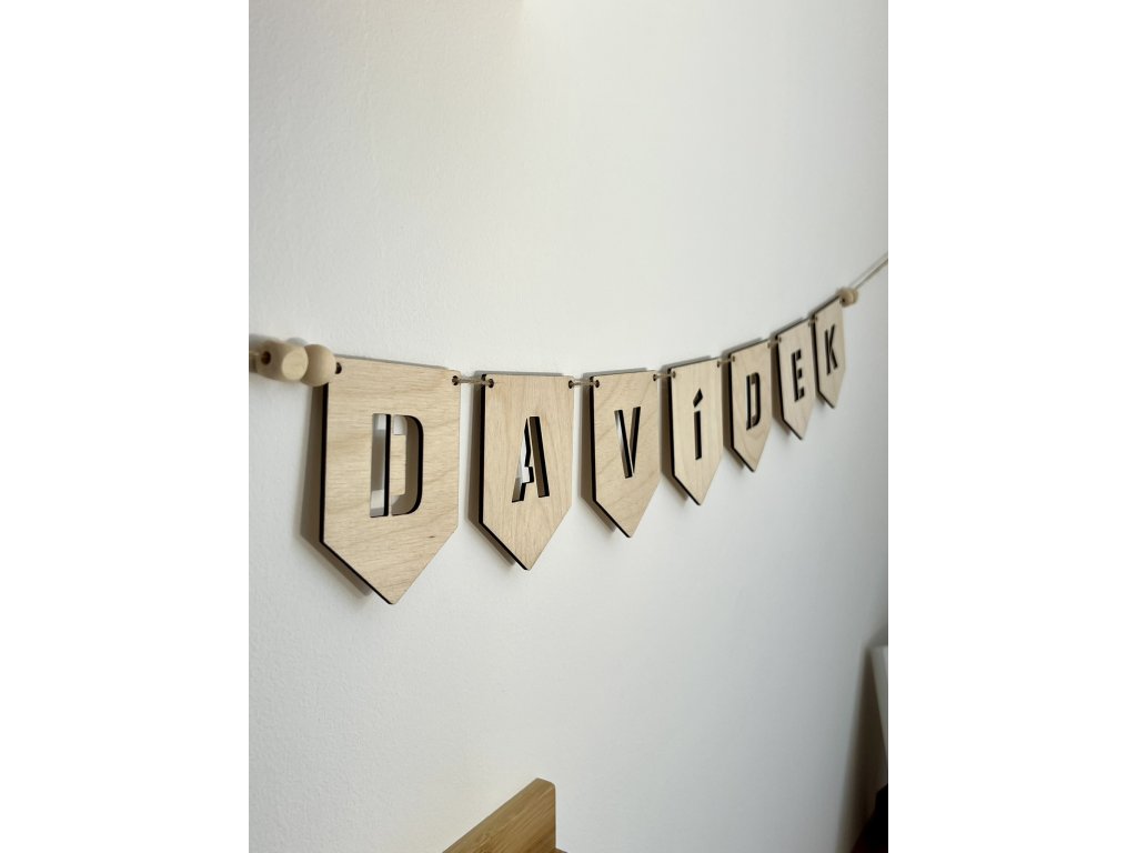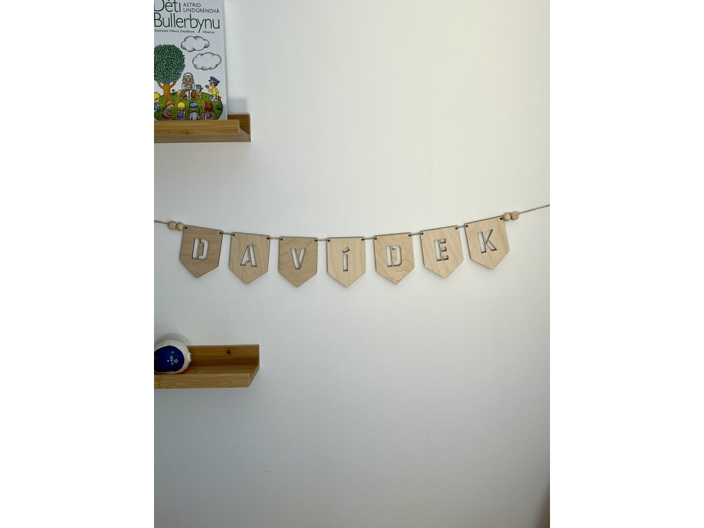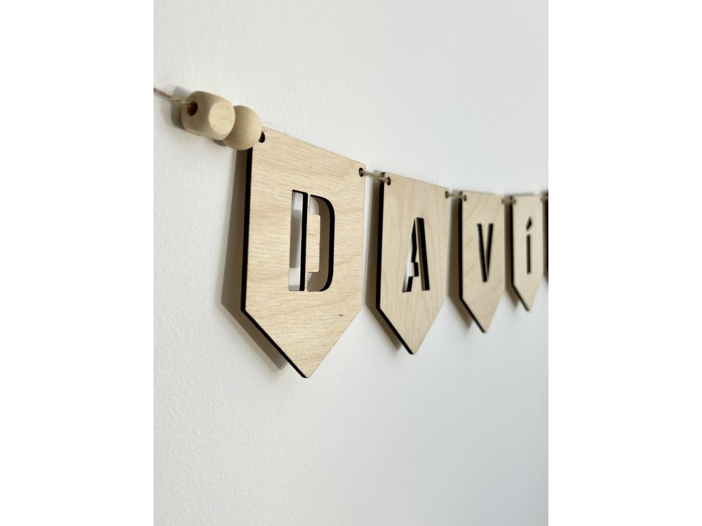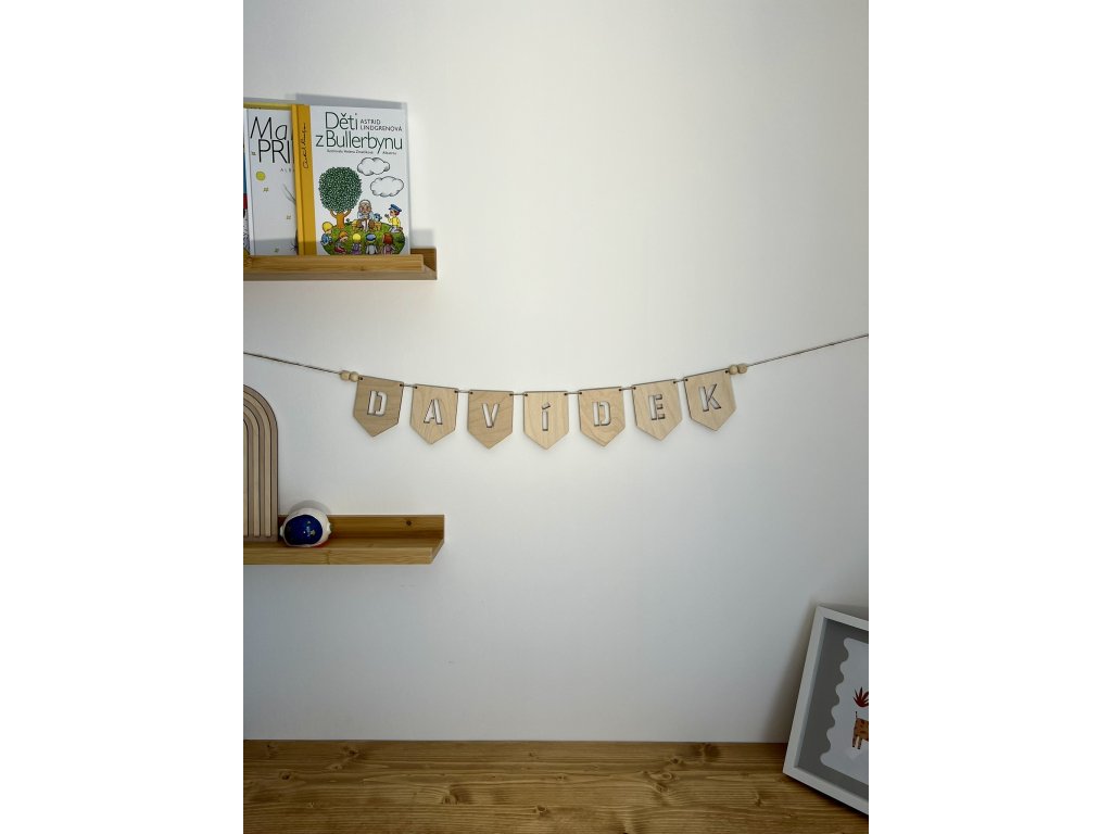 Dřevěná girlanda jako dekorace do dětského pokojíčku nebo jako dekorace na dětskou oslavu. Poskládejte si text dle Vašeho přání. Girlanda je navlečena na provázku a na každé straně zakončena dřevěnými korálky.
