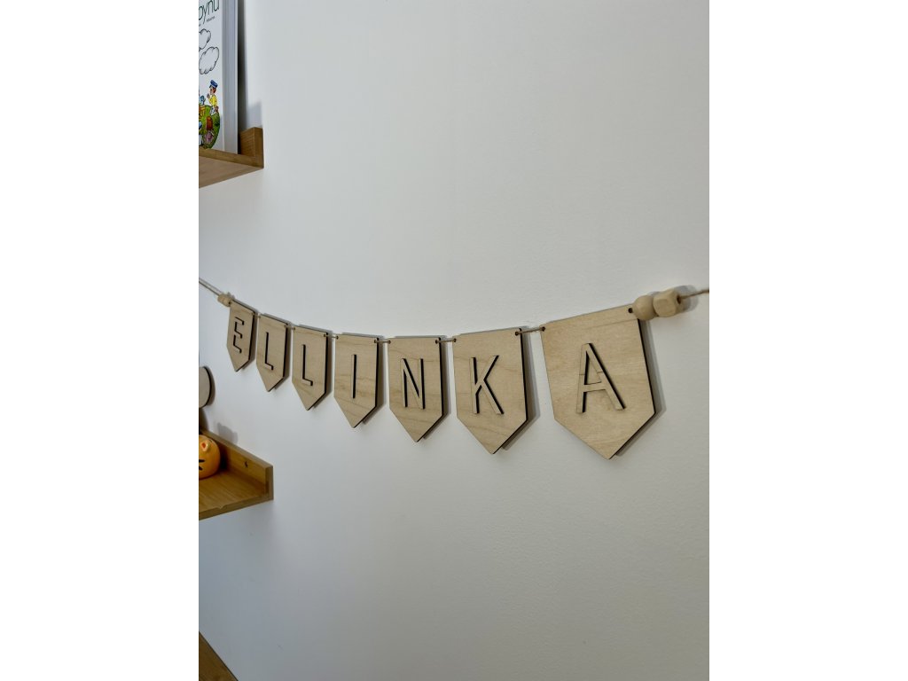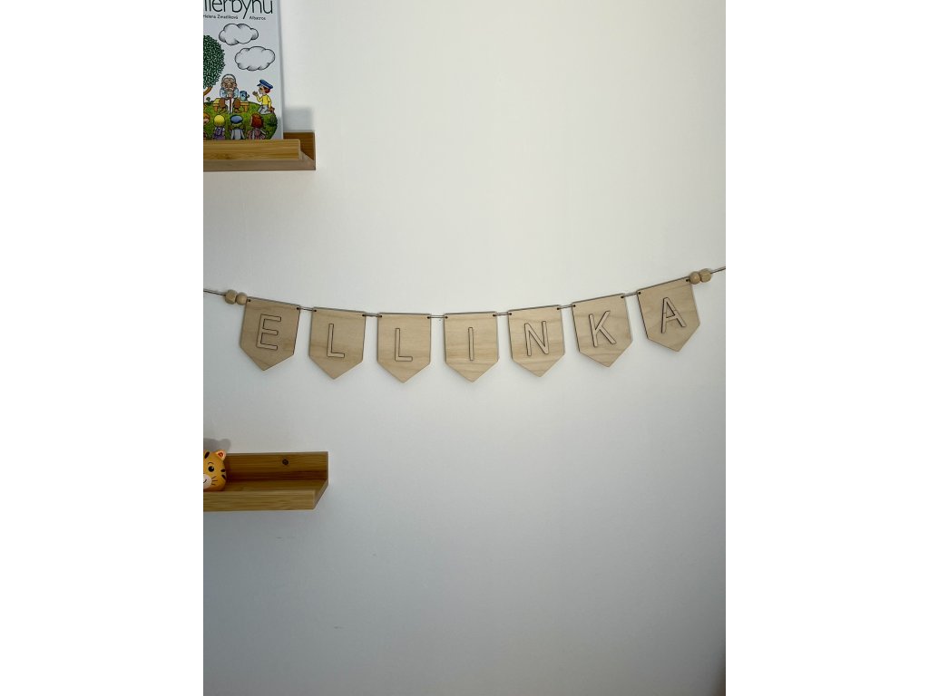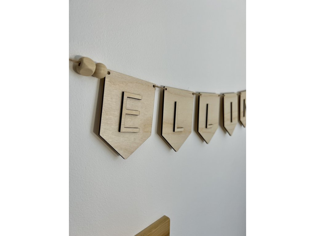 Dřevěná girlanda jako dekorace do dětského pokojíčku nebo jako dekorace na dětskou oslavu. Poskládejte si text dle Vašeho přání. Girlanda je navlečena na provázku a na každé straně zakončena dřevěnými korálky.