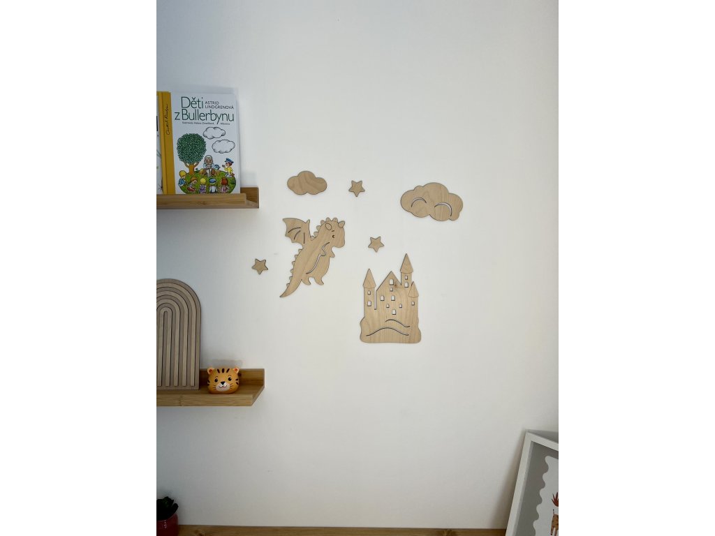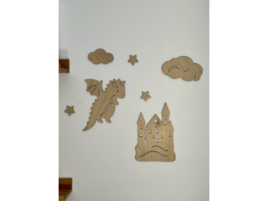 Tento set obsahuje hrad, dráčka, 2 ks mráčků a 3 ks hvězdiček . Upevnění na zeď pomocí oboustranné pásky (není součástí balení).