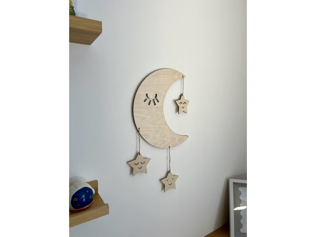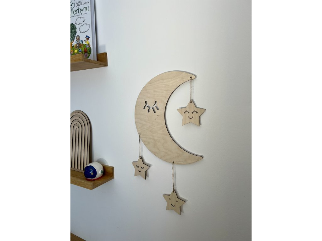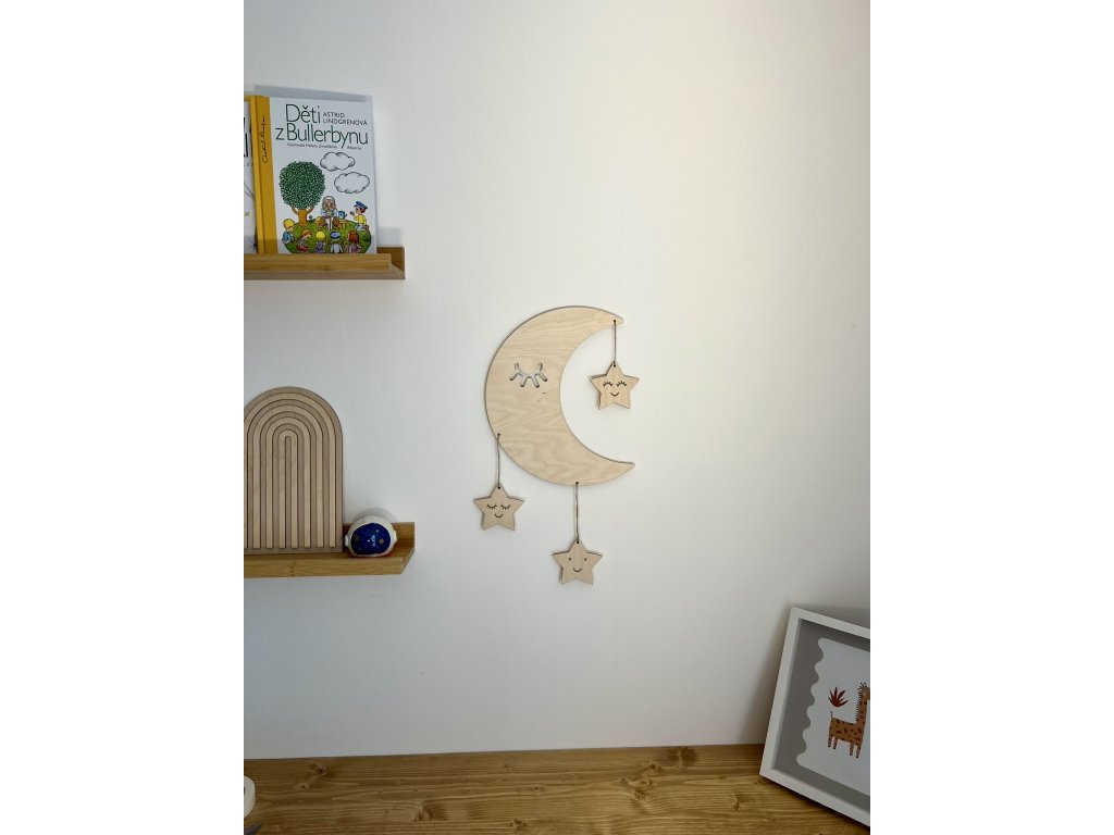 Měsíček se třemi hvězdičkami zavěšenými na provázku. Dekorace do dětského pokojíčku. Určeno k nalepení na zeď pomocí oboustranné pásky (není součástí).