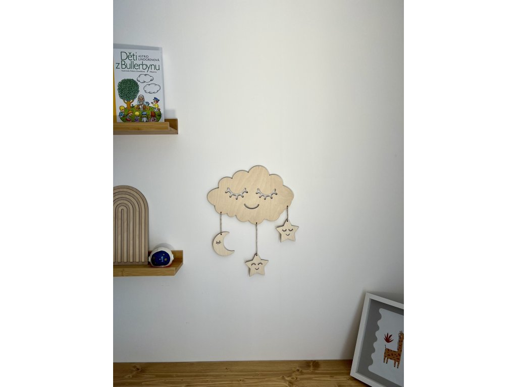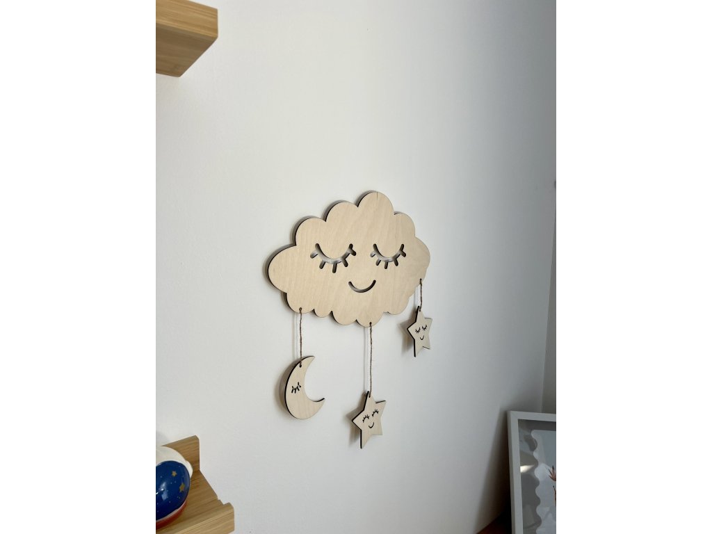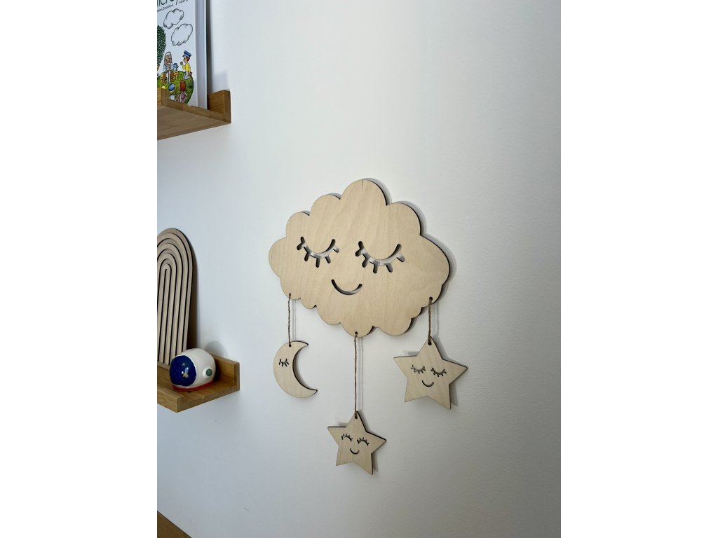 Mráček se dvěmi hvězdičkami a jedním měsíčkem zavěšenými na provázku. Dekorace do dětského pokojíčku. Určeno k nalepení na zeď pomocí oboustranné pásky (není součástí).