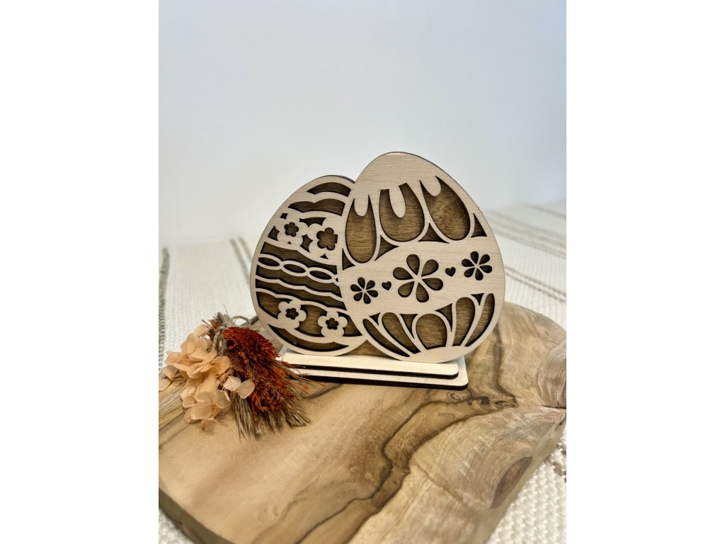 Velikonoční dekorace - dvě vajíčka s tmavým podkladem na stojánku.