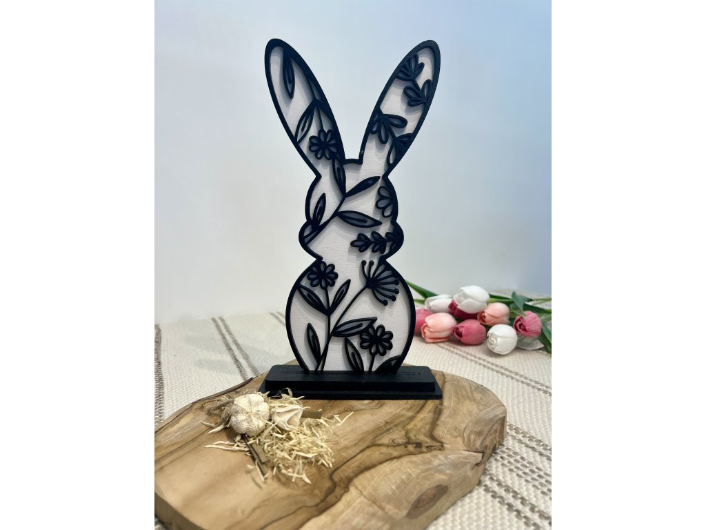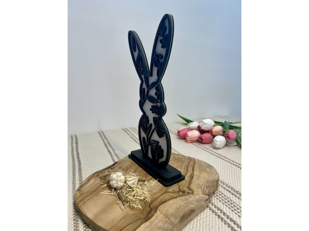 Větší velikonoční dekorace ve tvaru zajíčka v černo - bílém provedení se stojánkem.