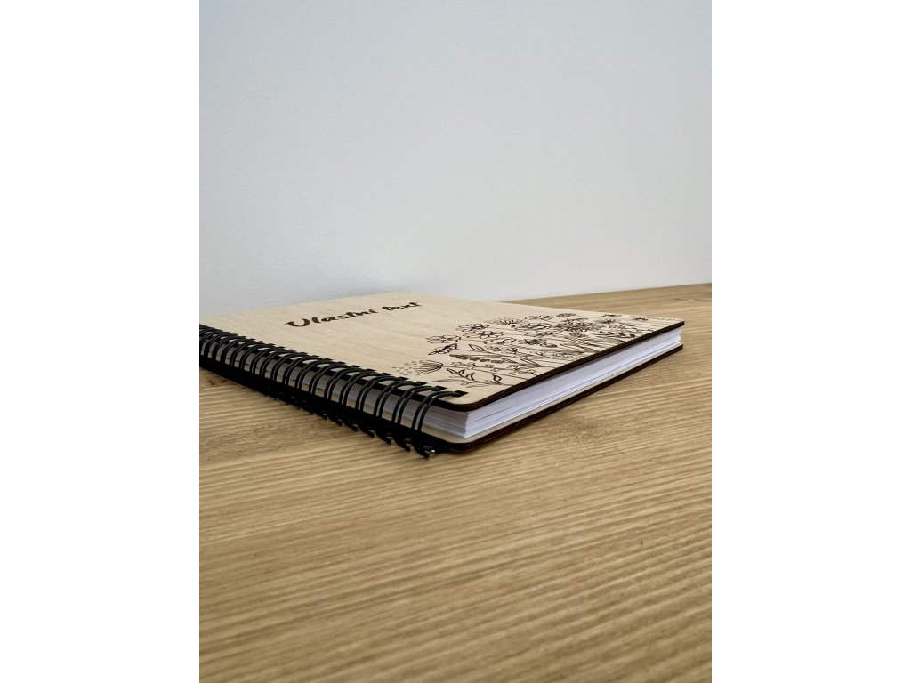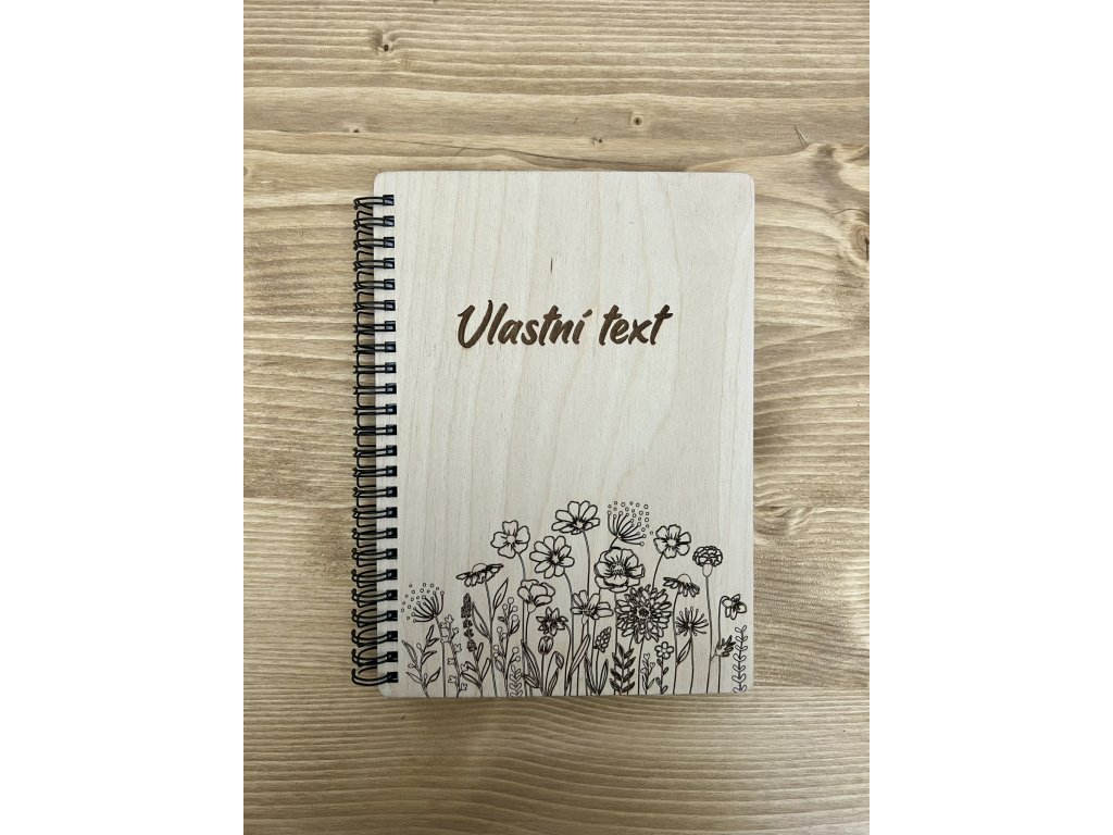Zápisník A5 s dřevěnými deskami s motivem lučního kvítí a textem dle Vašeho přání. Zápisník obsahuje 50 listů bílého čistého papíru. Zápisník je spojen kovovou vazbou zn. Renz.